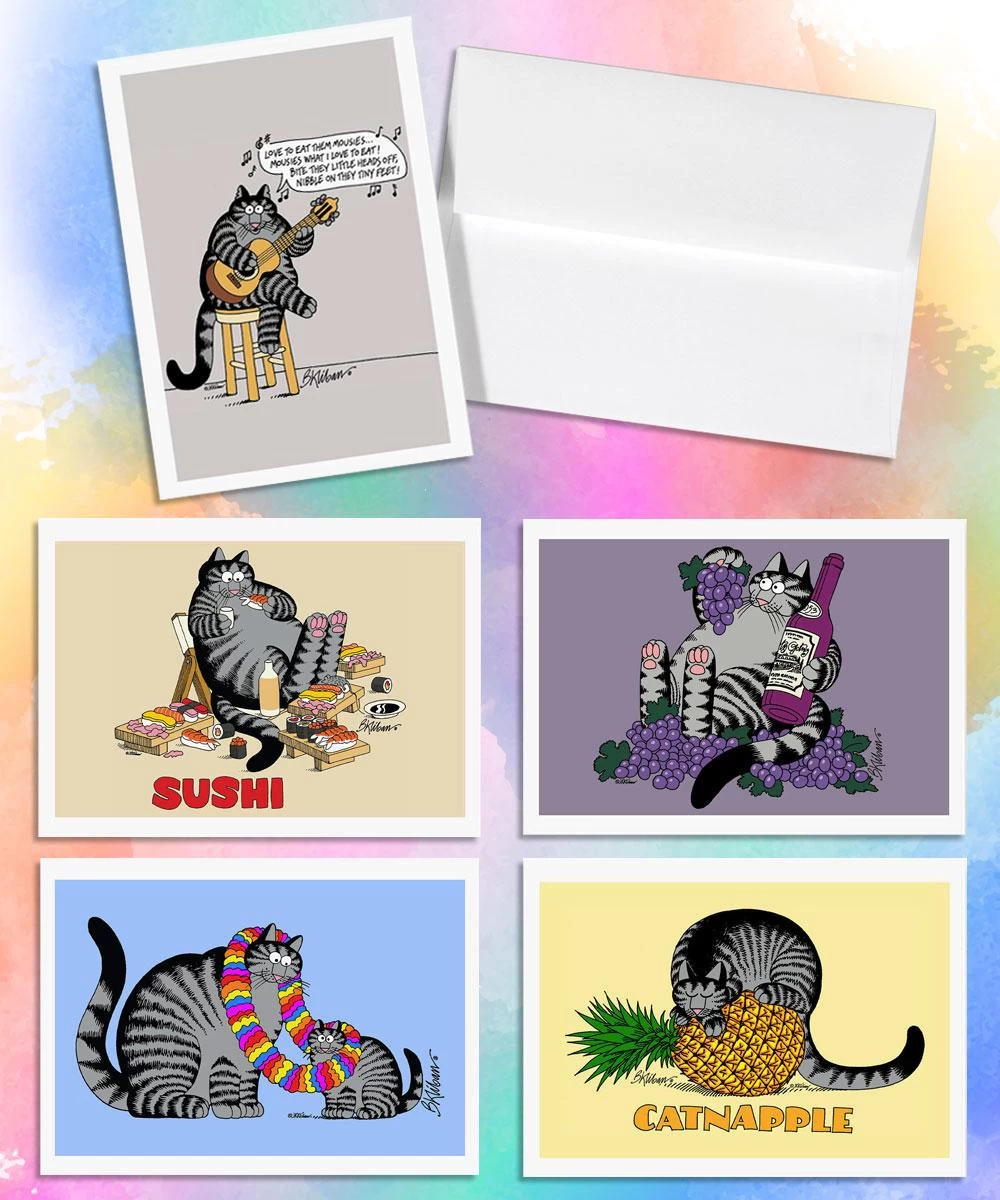 Send some love and looney-ness through the mail with Kliban cat note cards. With a collection of eight different designs, all your favorite felines are here to share with all your favorite folks. Made in the USA, these cards measure 6.38 inches high and 5.5 inches wide to give you plenty of room to write and to allow for colorful and crazy Kliban artwork on the fronts.