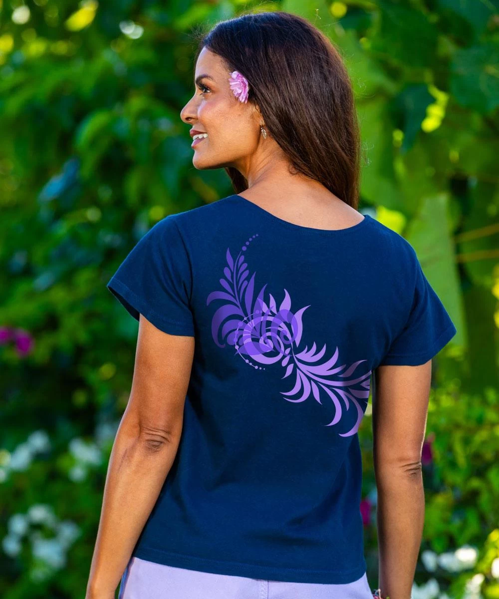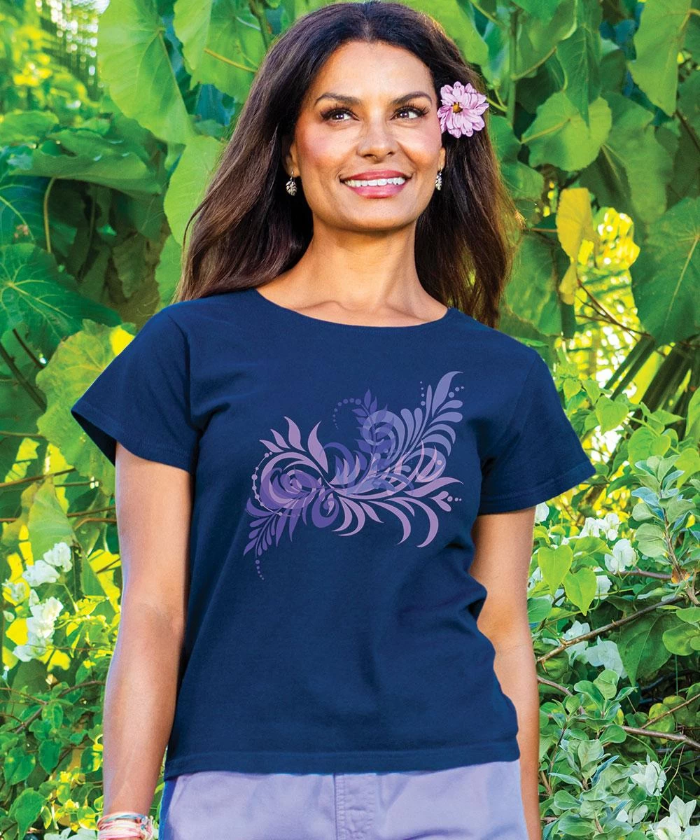Get lost in a forest of fashion in this design that flows around you like leaves blowing in the wind. The navy coloring fits with any outfit, making it so you can go anywhere or do anything in this amazing top. Made from 100% cotton that is ring-spun then combed to make it luxuriously soft, this tee also features a scoop neck and relaxed cut to be both cute and comfortable. We only use environmentally friendly water-based inks that penetrate the material’s fiber resulting in more vibrant colors, softer feel and artwork that doesn’t crack or peel. Plus, it is proudly printed in the United States for quality you can see and designs that stand the test of time.