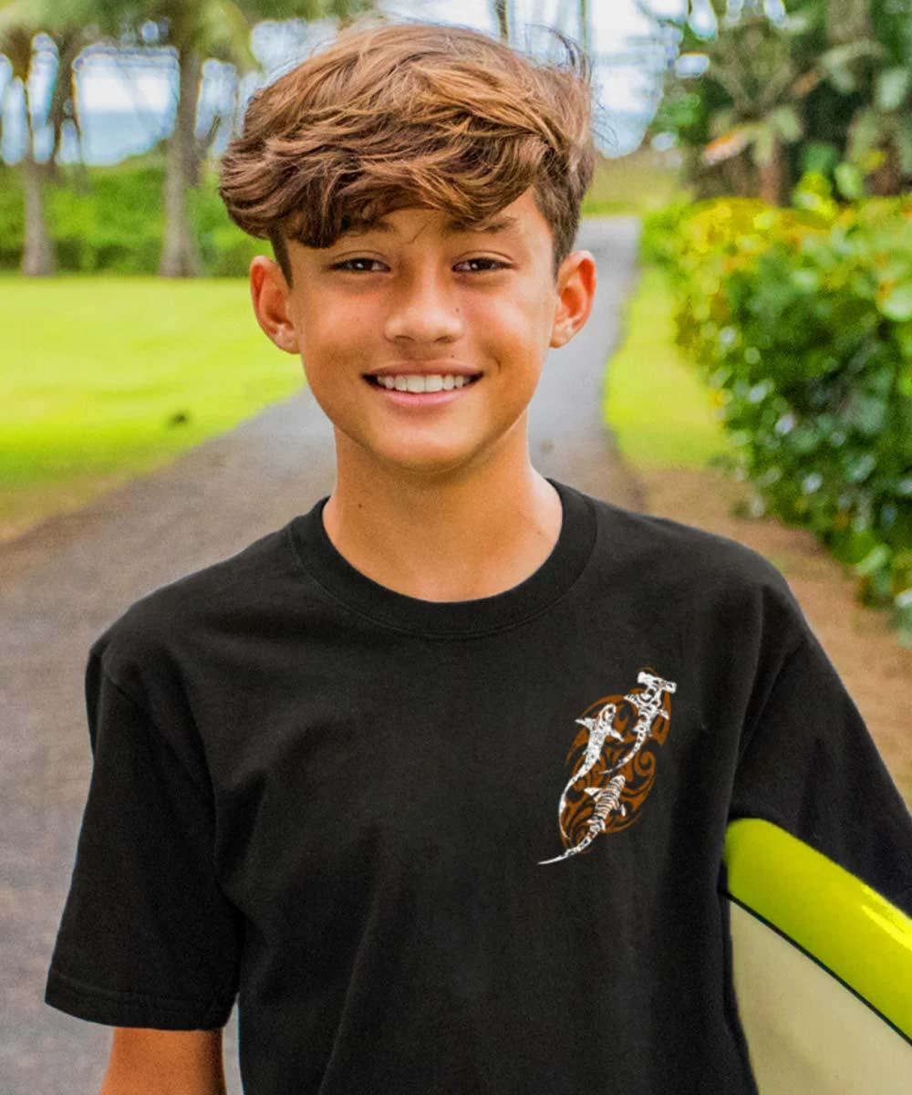 Three of the most aggressive sharks in the world get tribal renditions to show how Native Hawaiians revere these amazing animals. Paired with the bold black material, these images create fearless fashion for any youngster. Made from 100% cotton that is ring spun then combed to remove impurities, this fabric is luxuriously soft and lightweight yet incredibly strong. We only use environmentally friendly water-based inks that penetrate the material’s fiber resulting in more vibrant colors, softer feel and artwork that doesn’t crack or peel. Plus, it is proudly printed in the United States for quality you can see and designs that stand the test of time.
