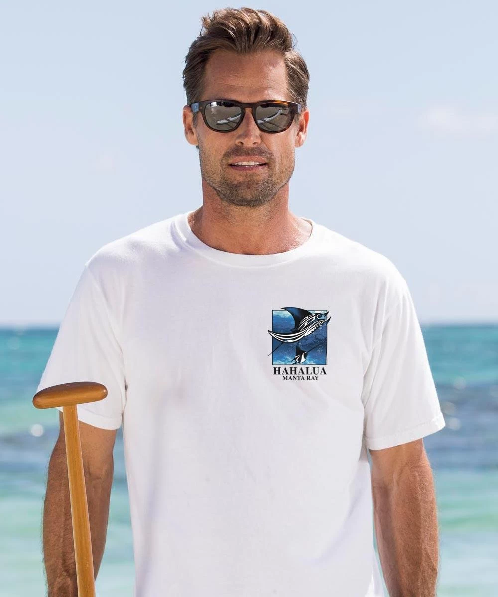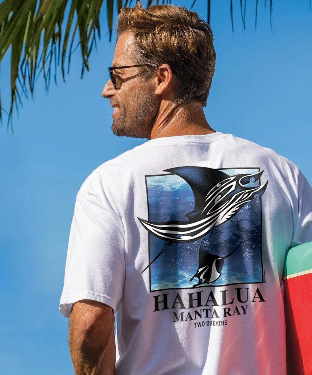 Hahalua means two breaths in Hawaiian and it is also what native islanders call manta rays because when they jump they transcend the realms of air and water. You can see these amazing and revered creatures in their natural element thanks to this stunning original piece of artwork that’s sure to take your breath away. Made from 100% cotton that is ring-spun then combed to remove impurities, this fabric is luxuriously soft and lightweight yet incredibly strong. We only use environmentally friendly water-based inks that penetrate the material’s fiber resulting in more vibrant colors, softer feel and artwork that doesn’t crack or peel. Plus, it is proudly printed in the United States for quality you can see and designs that stand the test of time.