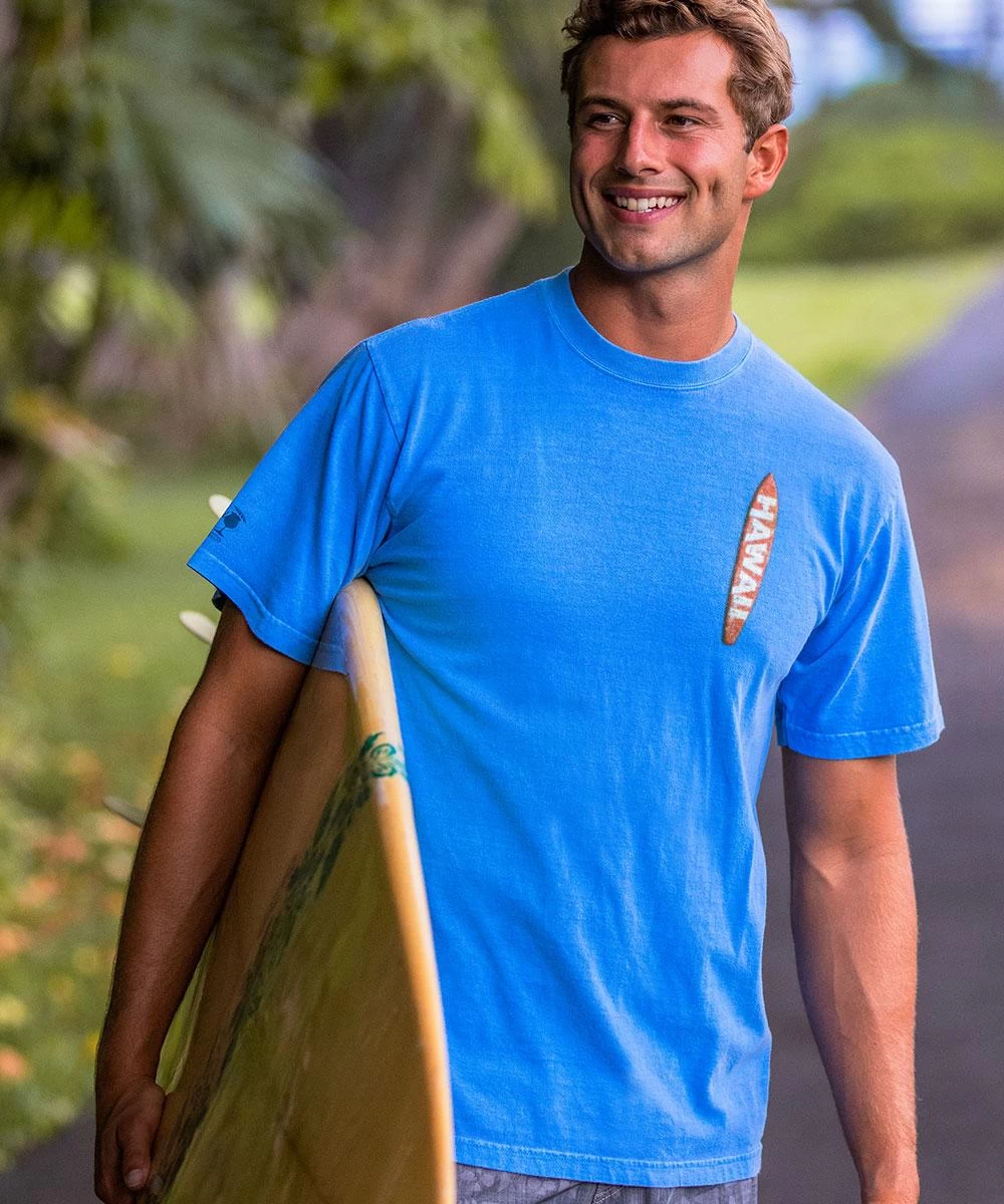 Throw it back to the early days of surfing with this colorful quiver of surfboards. The Blue Hawaii dye gives it an ocean spirit and big style that is reminiscent of the big waves at the North Shore. Made using our exclusive specialty dyeing process that uses real blue curacao liqueur and featuring 100% combed ring-spun cotton, this t-shirt has 50+ SPF protection to keep you feeling cool, calm and protected all year long. We only use environmentally friendly water-based inks that penetrate the material’s fiber resulting in more vibrant colors, softer feel and artwork that doesn’t crack or peel. Plus, it is proudly printed in the United States for quality you can see and designs that stand the test of time.